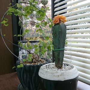 柱の色がおかしくなってきちゃったよ。 んで、今年の室内1号、出窓に入れてみた。このままだとかなり気温は低くなる。でも外よりマシ。 テラスにはサボワゴンがひとつ入っているけど、 外と気温的にはあまり変わらない場所。 日当たりはいいが、雨風が防げると言うだけ。洗濯物を落とさないかとヒヤヒヤ😅ビニール掛けよかฅ(´ω` ฅ)ニャー