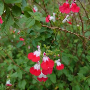 こんばんは😌☕💕 マンションの駐車場の植え込みに可愛いチェリーセージが咲いています😊💕 1️⃣チェリーセージ❤️赤が多め❤️ 2️⃣白に赤い縁取り🤍❤️😘 3️⃣色が薄めの子🤭 4️⃣真っ白な子🤍😌 5️⃣ヒメジョオンも一緒に咲いています😊💕