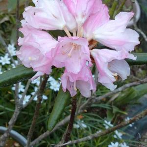 挿木した石楠花が花をつけました。まだ10センチほどの背丈なのに、こんなに大きな花で、ビックリ !