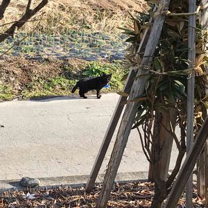 あらっ❗️ クロネコ発見❗️こっち見てる😺 石楠花の木、雪囲いが 窮屈そう😅💦 そろそろ、外してあげなくちゃね…😊