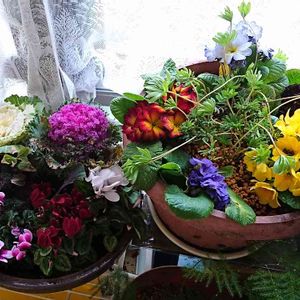 寄せ植えしてみました💠🌱💠 以前作った葉牡丹とガーデンシクラメン、元気です🎵 今回は、プリムラを寄せ植えしましたよ🎵