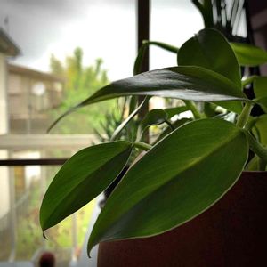 🌿 フィロデンドロン・シルバーメタル✧*。 🏷毎月8日は鉢の日に参加します🌿 シルバーグリーンの葉がカッコいいから渋めの鉢に植えています。鉢にも葉っぱ模様が入っています。 耐陰性があって生育旺盛⤴️これ以上大きくしたくないので伸びたらすぐ✂️しています。 白い花瓶の方は水挿し中🌱発根したので間もなく鉢植えにする予定です( •̀ •́ゞ)