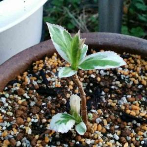 斑入りアジサイ 去年、挿し木したコ。 新芽が出てきた♡ 今年は大きくなってもらわないとね。 植え替えなきゃなぁ♪