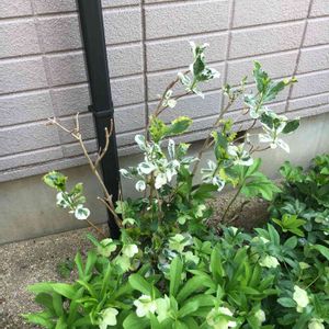 実家の北側に植えた斑入りアジサイです^ ^ 新芽が出て来ました。 他にホスタなど明るくなる様に斑入り植物を植えています。