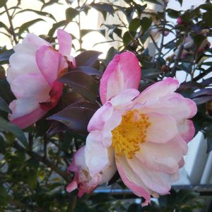 冷たい風が吹く中、庭の山茶花がきれいです。 縁取りがピンクのお気に入り。