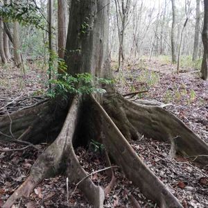コジイ(ツブラジイ)の板根 神戸市西区雄岡山にて 岩盤が硬く表土が薄い斜面に生えているため、深く根が張れません。そのため、斜面の下側に傾き易く、倒れないように板根が生長しました。