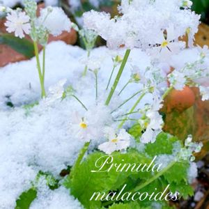 雪だあー‼️ 1月15日咲き始めたぁ‼️と投稿した "プリムラ マラコイデス" 他のコは、まだ咲かないけど このコだけは、いっぱい花が‼️ しかーし、雪で花がどこだか わからなくなりました💦 昨日、土がカラカラなので 水やりをしてる人がいました😎 ワタシです😅😅😅 何やってるんだー💦