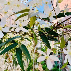 見上げてみたら 青空の下に真っ白な "クレマチス アーマンディ" キラキラ🌟してるわよ💕 昨年(4.3投稿)から咲き始めて 蔓は3倍くらい伸びて 花も3倍くらい咲いてます💕 来年はどうなるだろう😁🥰