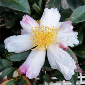 サザンカの白地にピンク縁の花 2023-12-21