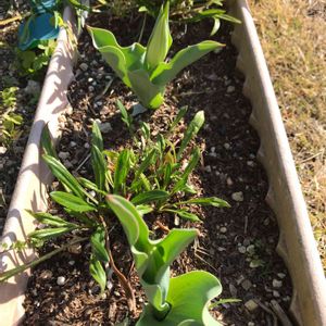 プランター組のチューリップ🌷⑤🤗 ガザニアの間にもチューリップの球根 植えました。🌱 だいぶ芽が伸びてき始めました。(^O^)