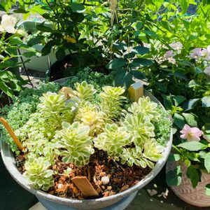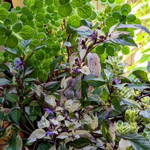 朝日を浴びて✨ アロマティカスさん嬉しそう^^ トウガラシのちっちゃな花と斑入り🌿の色合いで爽やかさを送りますෆ╹ .̮ ╹ෆ セダム アトランティスさんもエールを☘️ *美しく青きドヨウ*