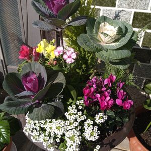 寄植え作って来ました🤗 葉牡丹 キンギョソウ アリッサム シクラメン ラベンダー ウィルマ ナデシコ であってるかなぁ🤔