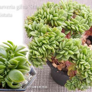 エケベリア、シャイニングパールの綴化。これは2014年にかったので2年選手。鉢を変えているので、縮尺が合っているかどうかわかりませんが、むちゃくちゃ大きくなりました。(葉っぱ一枚一枚は小ぶりになったかも)
