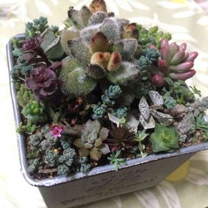 山梨県もらって会 多肉の寄植WS ② もけもけの葉っぱの子(名前がわからない😅)を中心に冬バージョンの寄せ植えをしました。もう一つのちまちま寄せに時間がかかってしまい、こちらは入れただけ😅できてみたらやはりスカスカだけど愛おしい😊