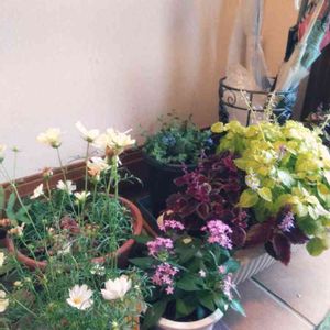 玄関に避難した鉢植えたち。 台風から守ったけど 猫に狙われてます😥