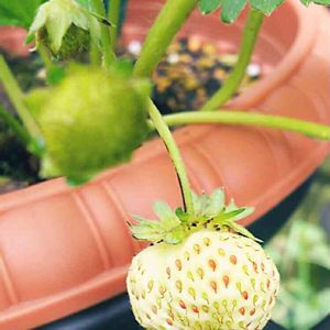 こんにちは😃 教えてコーナーで、イチゴのランナーの事質問されたので、丁度我が家の白イチゴエンジェルエイトが実とランナーをつけているので、投稿アップします。 ブロックに伸びている長いものが全てランナーです。 右奥に見えるのがイチゴです。この株には2粒だけ厳選して大きくしています。 イチゴ育てる気は、全然無いのですが、昨年の秋の紅葉深まった頃に、売れ残りになったイチゴ苗が特価100円で売られていました。売り札の写真は真っ白な実に赤いぶつぶつ。決して美味しそうには見えません。 養生再生大好きな私は、2株買って育てる事にした訳です。