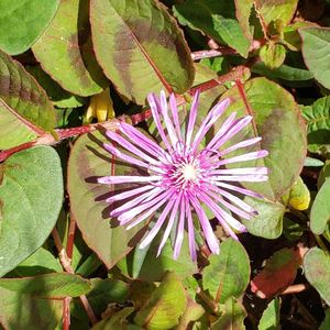 5月、皐月。緑が映えゆくこの時季に、私の散歩道の道際等の草花達は、まさに百花繚乱に包まれていくようである--- 4月からの、草花達の生きいきとした姿、姿---その29。 /緑幾多線状葉の中、色鮮やかに三角形作る3つの花/ 所用後に外に出た直ぐの道際。そこに置かれるブロックプランターに何か赤く光るもの見た。そこに近づく。 そこには、一株の濃い緑の幾多の細い線状葉の中に、美しく光沢を持った赤ピンク花が3つ、等距離を持って三角形を成して輝いていた。 マツバギク(松葉菊) ・マツバギク<松葉菊>(ハナミズキ科 ハナミズキ属/ランプランサス属/デロスペルマ属) (備忘: マツバギクの属性等について 5/31 ‘21)