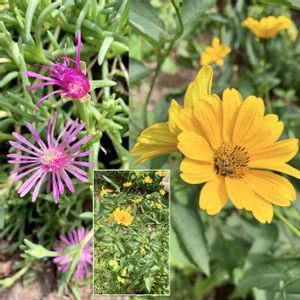 7月、もう後半。ここは、今年は梅雨が早めに明けたようだ。夏が強く感ぜられる時期に入る。私の散歩道の道際等の草花達は、徐々に、夏の強い陽を浴びて、バラエティのある色彩を表出しようしているようだ--- 6月からの、熱い夏に向けての準備に忙しそうな草花達---その13。 今を盛りに鮮やかに、時を失うも華かに咲く草花2つ。 ---久しぶりの雨上がりの、何時ものオープンガーデニング。 そこに目に入った、ヒロっとして姿勢で今が盛りに咲く鮮やかな黄花と、その根元には、これは時季を少し失っているとはいえ、未だ華やかな光彩を精一杯に放っていた草花が、何かしら共鳴していた。 姫(ヒメ)ヒマワリ(姫向日葵)と、マツバギク(松葉菊)。 ・マツバギク<松葉菊>(ハナミズキ科 ハナミズキ属/ランプランサス属/デ ロスペルマ属) (備忘;マツバギクの属性等 5/31 ‘21) ・姫(ヒメ)ヒマワリ<姫向日葵、別名 キクイモモドキ<菊芋擬>、ヘリオプシス、イシイモ<石芋>>(キク科 キクイモモドキ属/ヘリオプシス属) 北アメリカ原産の宿根草。 属名のヘリオプシスあるいは宿根姫ヒマワリと呼ばれることもある。大変丈夫で、黄色の花がたくさん咲くところから、夏の花壇用によく植えられる。 宿根ヒマワリあるいはヘリアンサスの名で流通しているヘリアンサス属のものとは属が違うが、名前だけでなく草姿や花もよく似ているので、混同されることがある。 また、ヒメヒマワリとすると、一年草のヘリアンサス・デビリスのことだとされているので、一層ややこしくなる。 ヘリオプシスとすべきかもわからないが、姫ヒマワリと呼ばれていることも多いので、ここではそのようにしている。 草丈:1~1.5mほど。 花: その名のとおり鮮やかな濃い黄色の花が咲く。 花径は3~6㎝ほどで一重咲きと八重咲きがある。 出典・参考; 365花撰)
