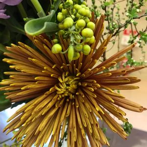 アレンジで使った菊花が見事に満開❣️ 一輪ですごいボリュームです🎶 Chispa スパイダーマム ディスバッド系(一輪の大きな菊)は華やかでとても個性的❣️細長い花弁はとってもクール😃👍