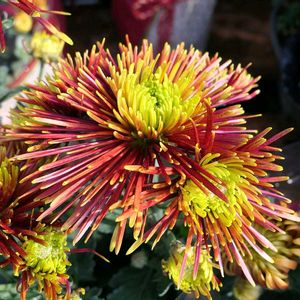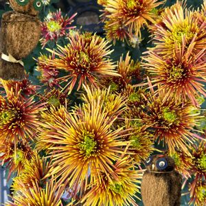 【ディスバッドマム「チスパ」】 中国原産、キク科多年草 ディスバッドマムは、1本の茎に対して花が1つだけ咲く大輪の洋菊。 「チスパ」とは、スペイン語で火花という意味。中心の濃いオレンジ茶から黄色になるグラデーションが美しい。 ディスバッドマムの中でもスパイダー咲きと呼ばれる咲き方をしており、糸のような花びらが放射状に広がり、開花するとまるで花火のようにふんわりと広がる。 草丈:50〜60cm 花色:黄色~オレンジ色 開花時期:11月~1月 山口市ホームセンターにて