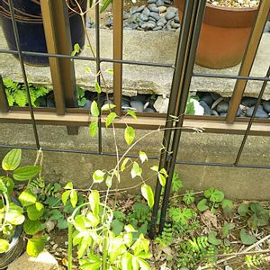 クレマチス パテンス系 『妖精』 植えて数ヶ月で枯れ果てて 半分諦めてたのに、ぐいぐい伸びて絡んできました💕