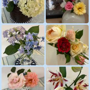 娘の着物後藤主催のパーティ 「オペラ歌手と着物を楽しむ会」 が昨日開催されました。 お手伝いできることをして、その後楽しく参加し音楽と食事を楽しみました。 1月の心臓バイパス手術から半年弱、心配をかけた、ひとり娘との時間がありがたいです。全快以上にパワーアップできた気がします⤴️皆様にも心配、応援コメントいただきました。この場を借りて改めて、ありがとうございました。 八月上旬まで同じ時間帯の日本にいます🇯🇵 1、受付用のアレンジメント 花器: 日本製、球形のガラスの器 花材: 紫陽花、八重咲トルコキキョウ、南天、ノコギリソウ 2、テーブル用6点と前出の受付用上から撮りました。 3、プログラムの表紙 初めの少し司会を頼まれましたが、あらら口が回りません🤣ご愛嬌🙏 4、会場の様子を遠くから。この七夕の🎋飾りは私が作り、竹は娘の庭の黒竹をダーリンがカット💪 5、昨年帰る前に選んだ浴衣の反物、出来上がって初めて袖を通しました。着心地最高。 帯は兵児帯でゆったり、下駄も新調、写っていなくて残念🫤