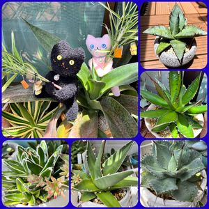 勝手に7日は爪エッジ棘の日🏷️ 毎月7日はアガベの日🏷️参加しまーす😆 庭の姫笹で小さな七夕飾りを作りました🎋 ノアと小町が早く元気になりますように🙏 今日はアガベの日なのでソクニャンは大きなマンガベ・マチョモカの上に😸下には五色万代もチラ見え😆 ↗️から時計回りに チタノタ ブルー ホリダ 風雷神縞斑(きゅうちゃんさんから🎁) パープソルム 輝山