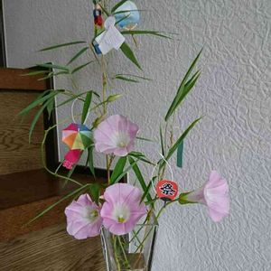 笹の葉さーらさら♪♪ 庭の笹と道端に咲いていたヒルガオを生けて小さな七夕飾りを作りました。