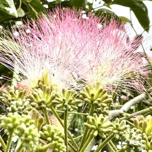 こんばんは🎶 ネムノキのお花が咲いて来ました🎶 夏至です♡ 夜7時はまだ明るいけれど夕方はもう葉っぱを畳んでオネムの準備ですね♡🌿💤