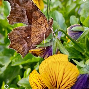 ビオラとキタテハ🦋✿*:・゚ 羽の表はとても綺麗 撮ろうと思ったら、閉じてしまい残念💦でも、綺麗🎶 🦋❁︎*: