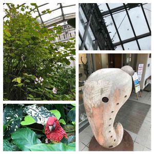 写真右下↘️箕面公園昆虫館の入口の 木でできた🐛ちゃん 放蝶園に入ると高い天井に舞い飛ぶ蝶↗️ 写真左上↖️何の木かな?下の方の植物には 萩のようなお花が咲いていました。 写真左下↙️ベニコンゴウインコ❤️(置物) と💚の葉✨✨✨🎶