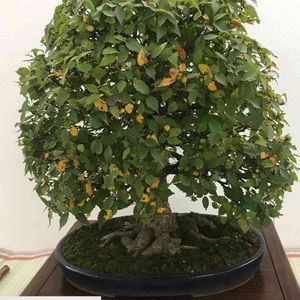 アカシデ(赤四手) ☘🌲☘ 赤芽ソロ ある盆栽展より…① 雑木盆栽として人気のある赤四手、根張りも良く大切に持ち込まれたものと思われます😊 少し紅葉が始まっていますね🍂