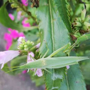 ハナトラノオの葉の上にいるオンブバッタの ♀ に背後から忍び寄る ♂ 2022-10-03