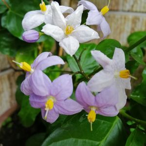 車庫で冬越しした「ヤマホロシ」ナス科。 今年はラティスに絡ませてみます。 早速、ひと房めの開花💜🌱 こちらも、薄紫で咲いて次第に白くなるツル性のお花です🤗