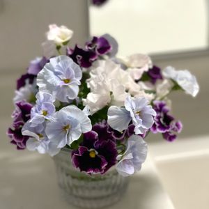 💜パンジーシエルブリエと絵になるスミレミュール💙 3/13の寄せ植えを切り戻ししたので綺麗なところだけ生けました。