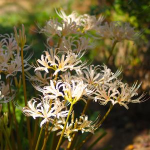 曼珠沙華💕 満開になりました*\(^o^)/* 頂きものの一株が数年経って随分賑やかになりました😊 クリーム色も咲き進むと白に変わり、優しい雰囲気で風に揺れています🎶♡︎ᵎᵎᵎ♡̷︎♡⃜︎♡⃡︎
