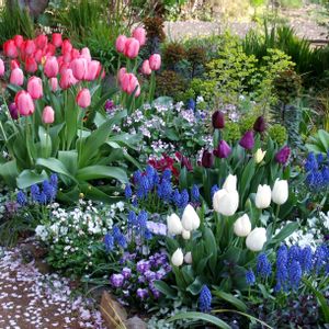 今日のお花 チューリップ🌷 ムスカリ 💕 桜の下の冬花壇に植えた春の花たち。小径まで桜の花びらが飾ってくれました。 過去picです(^^)