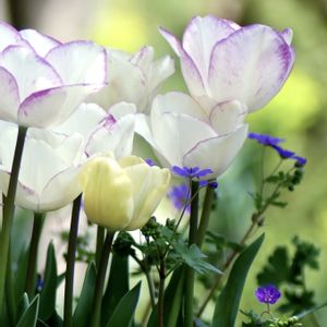 白いチューリップが桜吹雪のなかで、きれいに咲いています💕 咲き始めはクリーム色で、咲き進むと縁に紫が入り、上部のあたり全体が絞りのような感じでうっすら紫にかわってくるそうです。初めてなので、変化を楽しんでいます🤗💓 青い小花、ゲラニウム ビルウォーリスもなにげに可愛いでしょう❗️(^^)