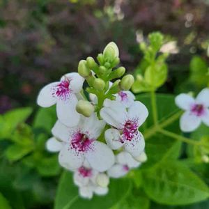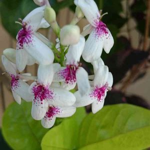 みずの森公園の温室にて 一番名前が読みにくく呼びづらかったお花🌸 プセウデランテマム レティクラツム😅 緑の葉に黄金色の葉脈がキレイです🌿
