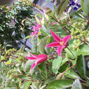 クレマチス プリンセスダイアナ 塀に絡んだヘンリーツタの蕾もかわいい 今日はいいお天気で嬉しそう
