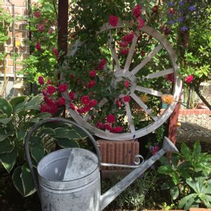 畑のパーゴラの中に車輪を置いてみました。 めっちゃ めっちゃ 重くて 私の力では動かせないよぉ〜❣️ ほんの1つで お庭の印象が ガラッと変わるもんですね⤴︎ ⤴︎⤴︎ とってもお気に入りに なりました😊💖