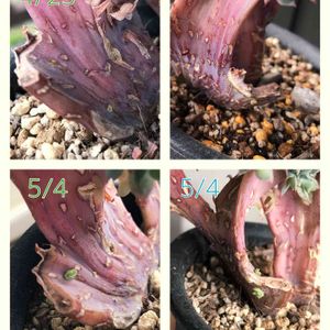 🏷️毎月10日は綴化の日 🏷️トトの日 1⃣植え替えて保険株も作ったよ🍀 DAISO多肉スペクタビリス綴化🍀 夜に撮ってるから色味が悪いけど、 濃いワインレッドの色してます🍷 2⃣あなたの名前は誰かなぁ? 名無し綴化🍀 3⃣強いから安心してオケツ向けて眠れるわ😽 保険株の一つ千羽鶴🕊 この後植替えしたよ🍀 4⃣ちょっと水不足であります💦 明日紅🍀 危ない💦危ない💦