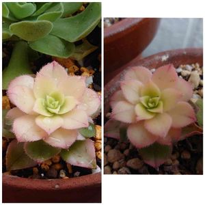【アエオニウム属 ハオルシー ドリーム カラー】 Aeonium haworthii ‘Dream Color’ Aeonium haworthii 'Tricolor ' Aeonium haworthii 'Tricolour' × Aeonium haworthii 'Kiwi ' 和名 夕映え 流通名 ハオルシー トリカラー ハオルシー トリコロール キウイ 春を迎えると、ベースの緑の葉が 黄色とピンクの3色に染まり、 最高に可愛らしい【夕映え】💗 夏を経て、やっとここまで復活 ナツハ、ズタボロデシタ (;-ω-)ノ 原種ハオルシーの栽培品種 【トリカラー】や【トリコロール】や 【キウイ】と呼ばれているようですが、 【ハオルシー ドリーム カラー】が 正式名称のようです🥝🌈 イギリスの王立園芸協会(RHS)で 「Award of Garden Merit」を受賞✨ 【GARDENIA】から抜粋 https://www.gardenia.net/plant/aeonium-haworthii-kiwi