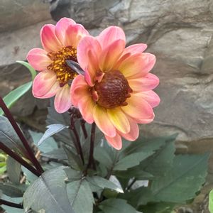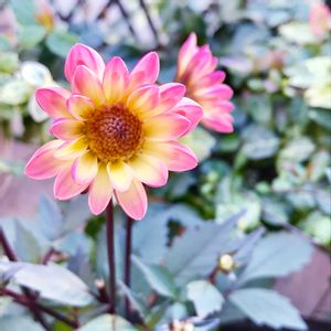こんにちは☀ 🌸銅葉ぷちダリア ピーチーラバーズ🌸 中心がイエロー💛 立体的な小輪のお花❀ ブロンズリーフがシックで 大人可愛い😍💕 毎年の楽しみが増えました🥰♬ ♬*゚・*:..。o♬*゚・*:..。o♬