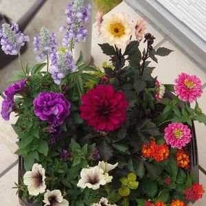 真っ赤なカシス色のダリアが咲いて何だか寄せ植えの色のバランスが変な感じで。。。HCへフラッと寄ったらこんなにかわいいダリアに会えました🧡 早速植え替えてこんな感じに💜 唐辛子さんにも馴染む良いお色だわ✨