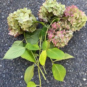 6/18投稿の 秋色紫陽花?? 剪定せず そのままにしてたら こんな色になって来た😁 昨日、雨の止んだ隙を見て 剪定して とりあえず 捨てずに 吊るしといた😅