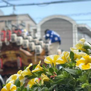 ふるさとの街の だんじり と斑入り🟡ペチュニア 昔...子どもの頃 暗くなるまで、だんじりを 引っ張って 街ぢゅうを 練り歩いたことを思い出す。。。