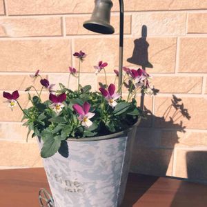 こんばんは🌠 昨日投稿したお花屋さんで買ってきた物 GSで見たことのあるブリキのかわいい鉢 見元ビオラ 「紅色ピョンピョン」 バコパ:ホワイト ガーデングローブ ピック 2種類