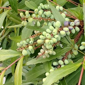 ホソバヒイラギナンテン (細葉柊南天) メギ科メギ属 常緑低木 🥬小葉はヒイラギナンテンより細い😃 🤗春に黒く熟す前の初々しい果実 🌼🌼🌼🌼🌼🌼 兵庫県神戸市兵庫区 神戸市立会下山小学校の西側歩道沿い