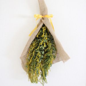 ミモザのスワッグ。 4日間生花で楽しんだ後、ドライにすることにしました。ミモザの蕾は咲かせるのが難しいんだそうですね。どおりで開かないと思いました。それを知ってなおさら、無印良品で買って良かったなと思いました☺️